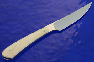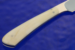 Warthog tusk handle scales are set to the full tang using stainless steel pins. The knife is very lightweight (just 2 oz!) and comfortable to hold, making it perfect for a daily carry fixed blade. From caping to fowl and fish, this bird & trout knife will be a tremendous piece out in the field.