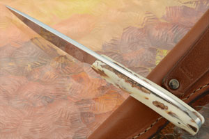 Warthog tusk handle scales are set to the full tang using stainless steel pins. This sturdy knife is comfortable to hold and has excellent balance. From caping and skinning, to cooking around the campsite, this knife has you covered as a perfect everyday carry!