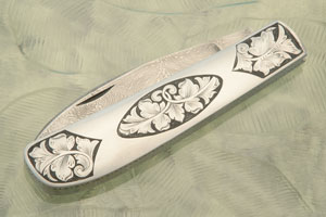 The stainless steel frame is hand engraved by Dunn. The engraving is floral scroll with a satin finished background. The top of the each side of the frame is fileworked by hand. At only 2.8 ounces, this knife is easy to carry and not even notice its on you.