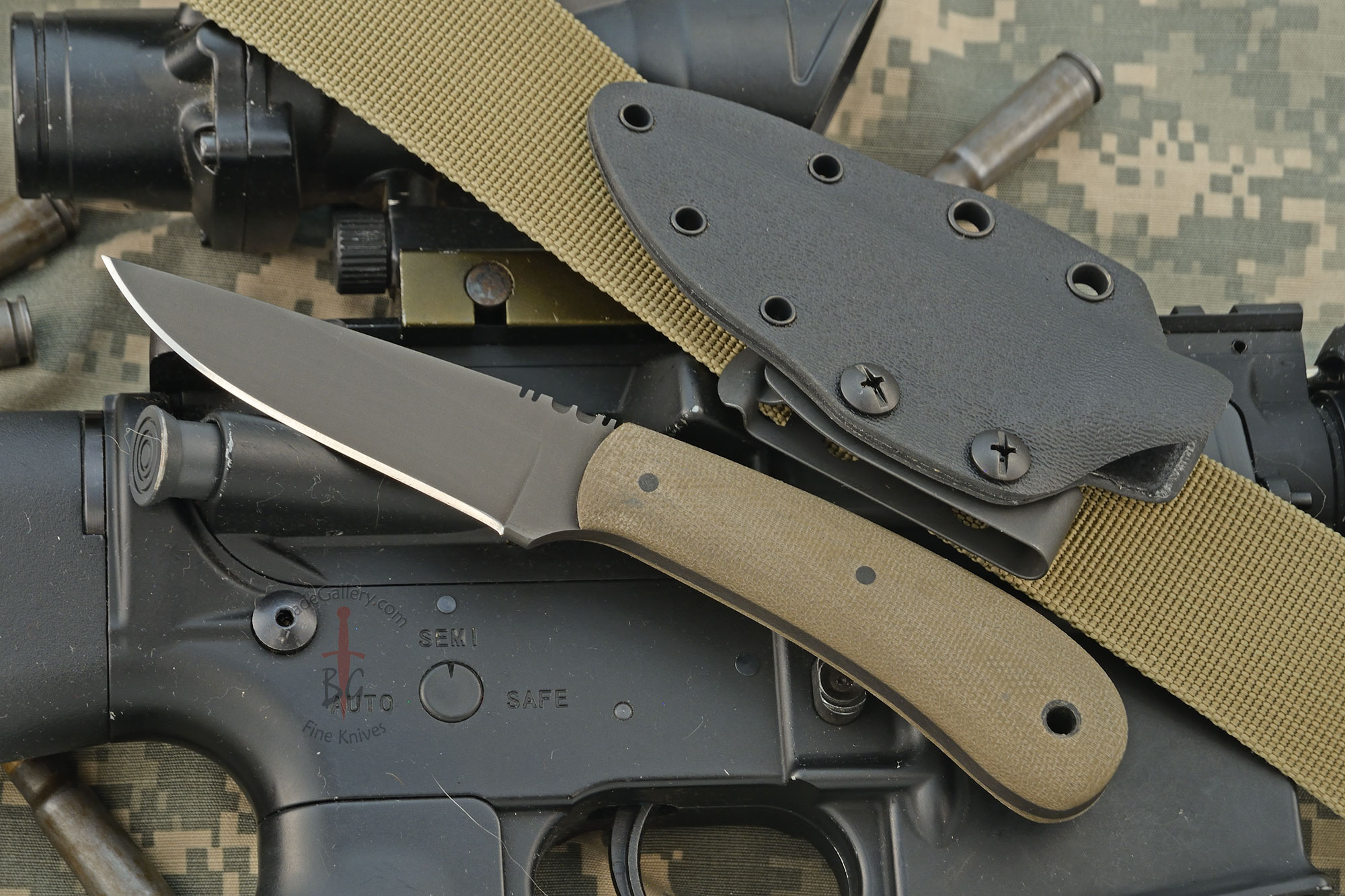 This knife includes a felt lined black Boltaron sheath with a metal belt clip attachment.