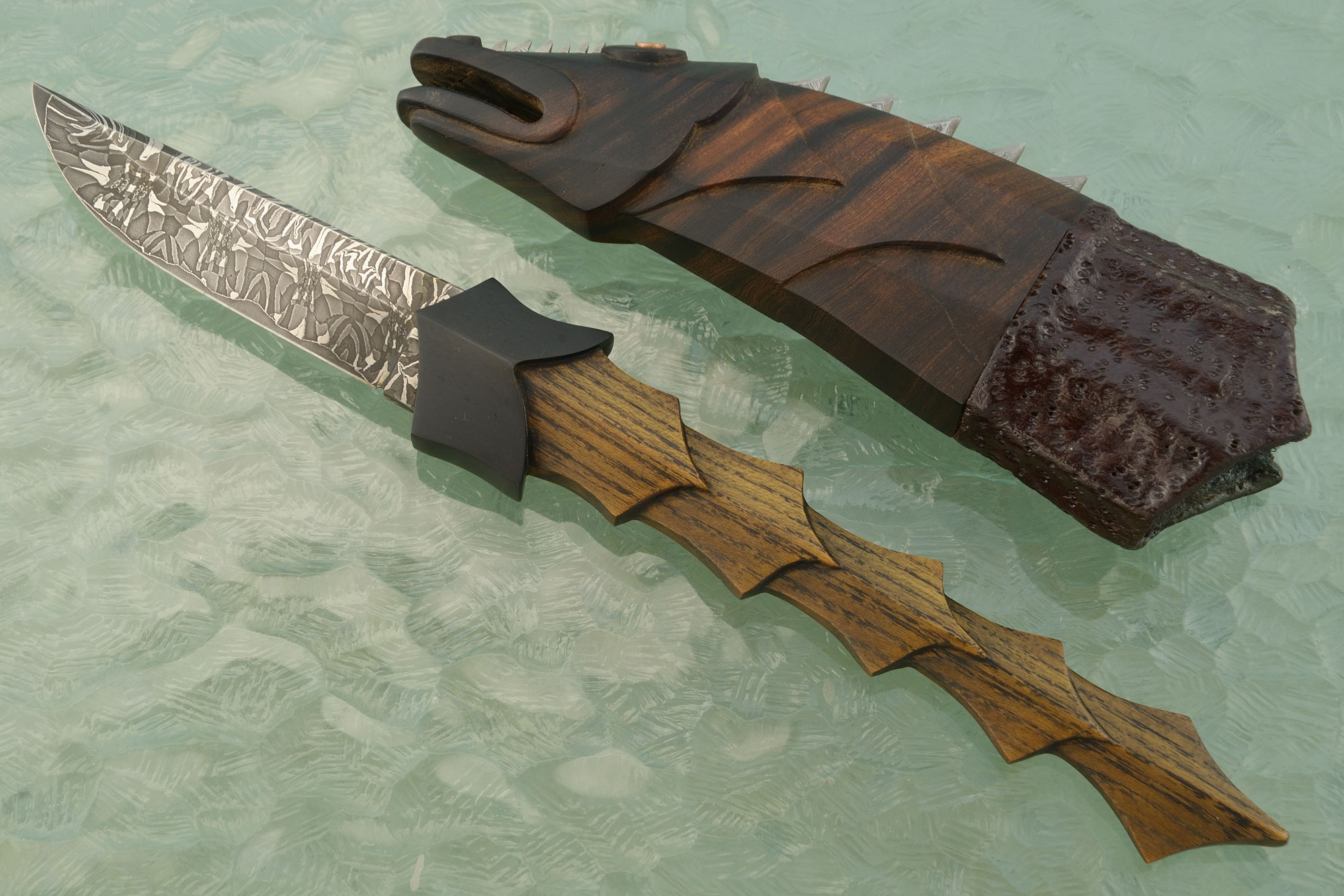 The sheath is sculpted Arizona desert ironwood to represent a serpent. The figure of the wood chosen is exceptional, complementing the motif well. Spikes along the top of the head are made from Matt Whitmus damascus. Eyes are formed from copper, brass, and steel. The back of the sheath is wrapped in ostrich skin, creating the appearance of serpent's leather.