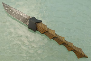 The handle is sculpted from osage orange to represent a serpent's tail. The terraced handle provides a comfortable grip and complements the wood sheath well. The African blackwood bolster provides an elegant contrast to the handle.