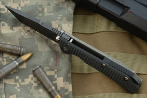 The blade is premium CPM-154 stainless steel, hardened to 59-61 Hrc and featuring a black oxide finish. This powdered metallurgical steel has a particularly small grain structure, making it take an extremely keen edge and hold it, while remaining tough and chip resistant. The blade can be easily opened using the dual thumbstuds which also act as a blade stop.