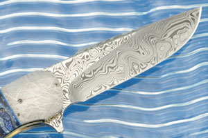 The hollow ground blade is Vinland pattern damascus forged by Damasteel in Sweden. The blade has smooth, drop shut action and is easily opened with one hand using the ambidextrous front flipper toggle. It uses the IKBS (Ikoma Korth Bearing System) pivot system. This mechanism, which was originally designed to fit balisong knives, uses ball bearings to create exceptional action with no blade play. This special folder is made with ceramic ball bearings. Generally IKBS bearings are made either from tool steel or from stainless steel. Stainless steel can wear away, resulting in uneven action over time. Tool steel bearings can oxidize making the action rough. Ceramic bearings are the best of all worlds -- extremely hard and wear resistant, they are also inert and will not oxidize.