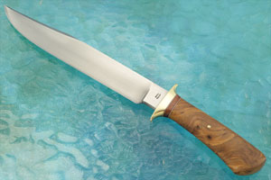 The handle is sandpaper tree (Ficus exasperata) sculpted to provide a comfortable grip. The swirling figure of this light toned wood is very engaging. A spacer of camelthorn is surrounded by alternating black and white fiber spacers. A polished brass guard finishes the handle.
