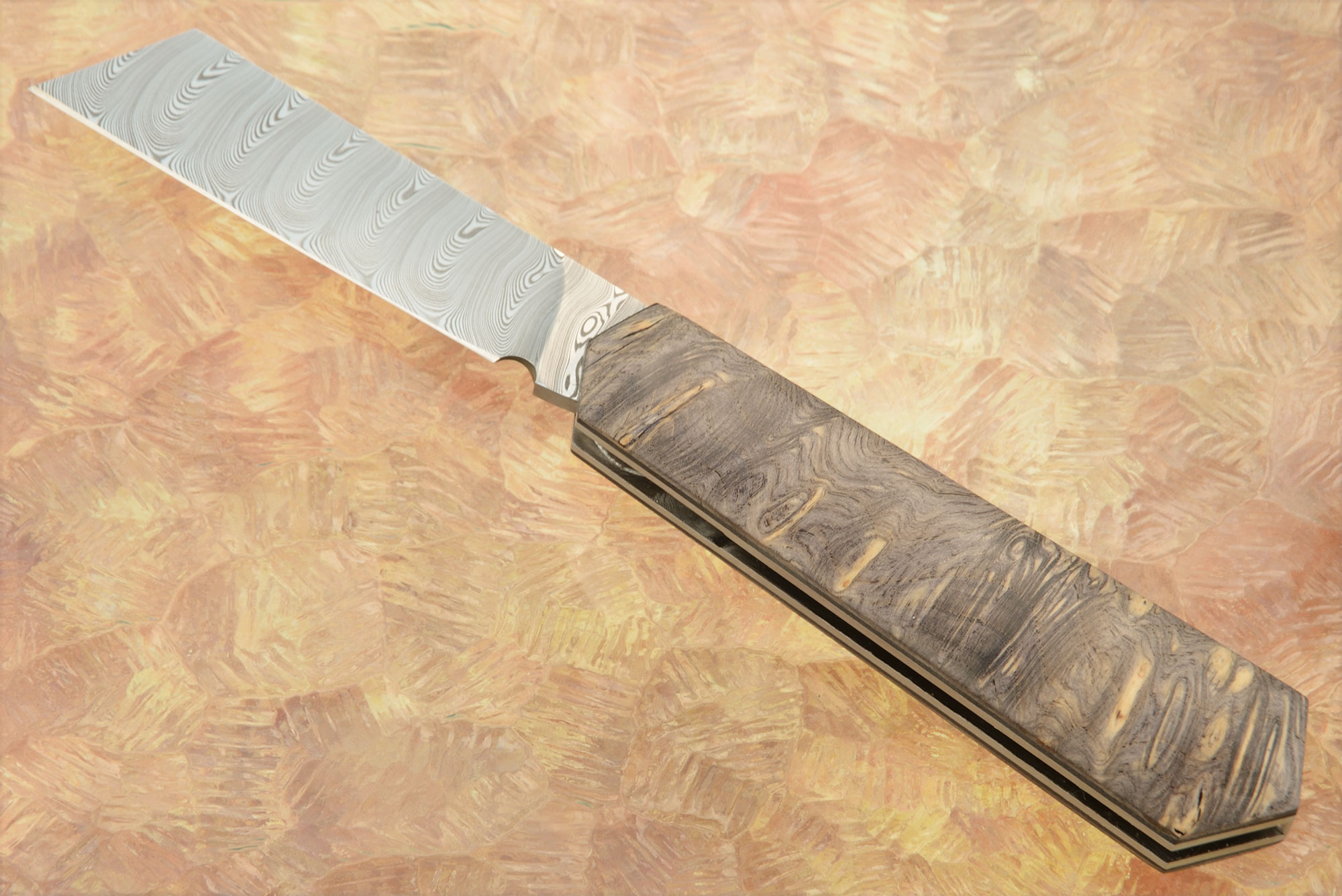 Handle scales are dyed and stabilzed oak burl set on stainless steel liners. Black liners assist the handle to adjust to temperature and humidity changes. Tinus' maker mark is engraved on the inside of the stainless steel backbar.
