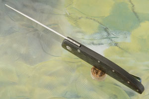 The blade is well centered and has smooth, consistent action. It is easily opened using the front flipper mechanism. With a little bit of practice, this style of flipper can be flicked out using your thumb or index finger, though it is generally rotated out with your thumb. The lock bar is grade V Titanium with a silicon nitride detent ball (Hrc 93!). The gently rounded carbon fiber handle feels comfortable in your hand, despite being so inobtrusive. A deep carry titanium pocket clip is mounted for right-side, tip-up carry.