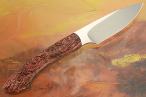 The dramatic handle scales are dyed and stabilized hemp fibers, suspended in resin. The scales are set on the full tang using stainless steel pins. This sturdy knife is comfortable to hold and has excellent balance. From skinning, to field processing, to cooking around the campsite, this knife has you covered!