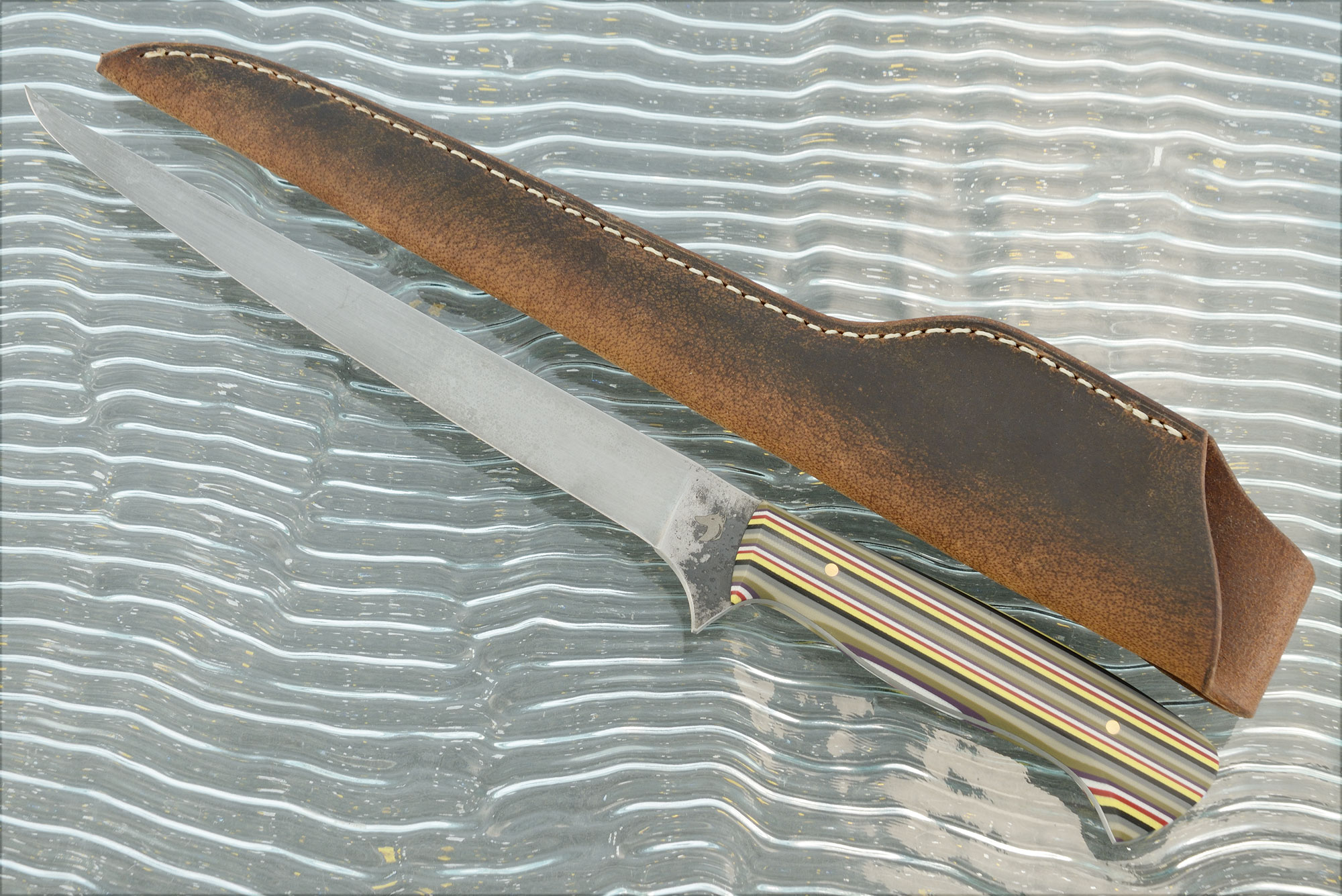 Description: This custom fillet knife was made by Gabriel Mabry (Doberman Forge) of Albemarle, North Carolina. Gabriel has a wide variety of skills from his background as a USMC marine, professional chef, restaurant owner, and certified welder. He uses these skills to make knives that will serve their owners for a lifetime just like his loyal family pet that his forge is named after! Gabriel also became a Forged in Fire champion in the September 15, 2017 episode of the acclaimed TV series!