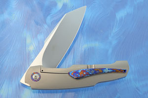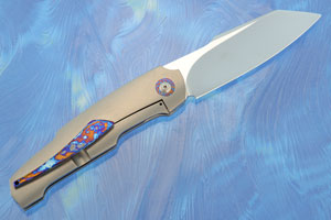 The 6Al-4V titanium handle features a bead blasted finish. The sturdy framelock provides a strong lockup. The pivot collar, backspacer, inlays, and pocket clip are matching heat colored White Timascus zirconium/titanium damascus. The pocket clip is mounted for right-side, tip-up carry.