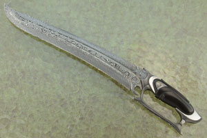 The massive 15-1/3 inch blade was forged from Roger's own multi-bar damascus, combining carbon steel to ensure excellent edge holding and chip resistance. A central bar of pool and eye damascus is surrounded by bars of twist damascus on each side. Finally, a firecracker pattern damascus edge and spine bar complete the blade. This combination of complex damascus is combined with a hand sculpted blade, easily placing this as one of the most dramatic blades I have ever seen!