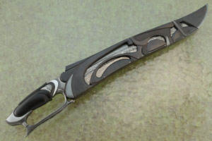 As you would expect from Roger, the matching sheath is also spectacular. Like the handle, it combines antiqued and textured pure silver with carved and textured African Blackwood. Windows in the sheath allow the blade to be seen when stored within.