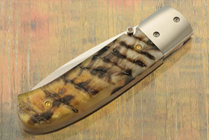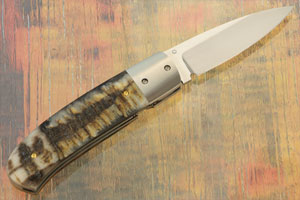 The blade is CPM-154 stainless steel with a hand rubbed satin finish. This powdered metallurgical steel has a particularly small grain structure, making it take an extremely keen edge and hold it while remaining tough and chip resistant. The blade can be easily opened using the right-handed thumb stud, inlaid with sheep horn. Mike's touchmark is on the left ricasso.