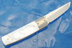 Presentation grade whitelip mother of pearl handle scales meet seamlessly with satin finished titanium bolsters. Titanium liners keep the knife light, yet strong. Jimping on the lockbar make the lock easy to disengage.