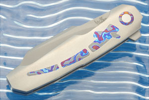The 6Al-4V titanium handle features a matching vapor blast finish. The sturdy framelock provides a strong lockup. The pivot collar, backspacer, inlays, and pocket clip are matching heat colored Black Timascus zirconium/titanium damascus. The pocket clip is mounted for right-side, tip-up carry.