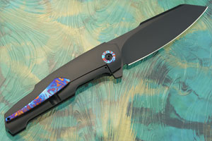 The 6Al-4V titanium handle features a matching blacked out Cerakote finish. The sturdy framelock provides a strong lockup. The inlays, backspacer and pocket clip are matching heat colored Timascus titanium damascus. The pocket clip is mounted for right-side, tip-up carry.