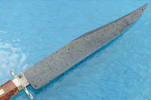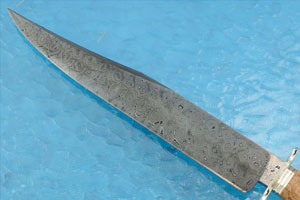 Stuart hand forged this massive 15 inch bowie blade from his own cross hatch pattern damascus, combining 1090 and 15N20 carbon steels to ensure excellent edge holding and chip resistance. It is high contrast, extremely detailed, and shows tremendous skill at the forge. The spine features a long clip that stops just short of being fully sharpened. Stuart's touchmark is on the right side and his J.S. mark is on the left side.
