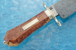 The coffin handle is hand contoured presentation grade two-tone amboyna burl, combining sapwood and heartwood. The wood has a swirling figure that nicely complements the damascus blade. The nickel silver guard is brought to a high polish and features coined hand filework. The large matching spacer is fluted and stippled for an elegant finish. A satin finished escutcheon is set onto the right side of the handle.