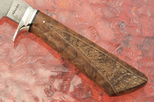 The stabilized brown mallee burl handle is sculpted and textured. The handle is well shaped and extremely comfortable.