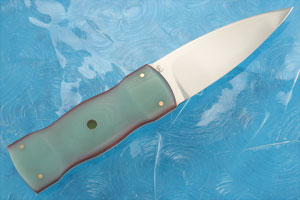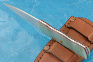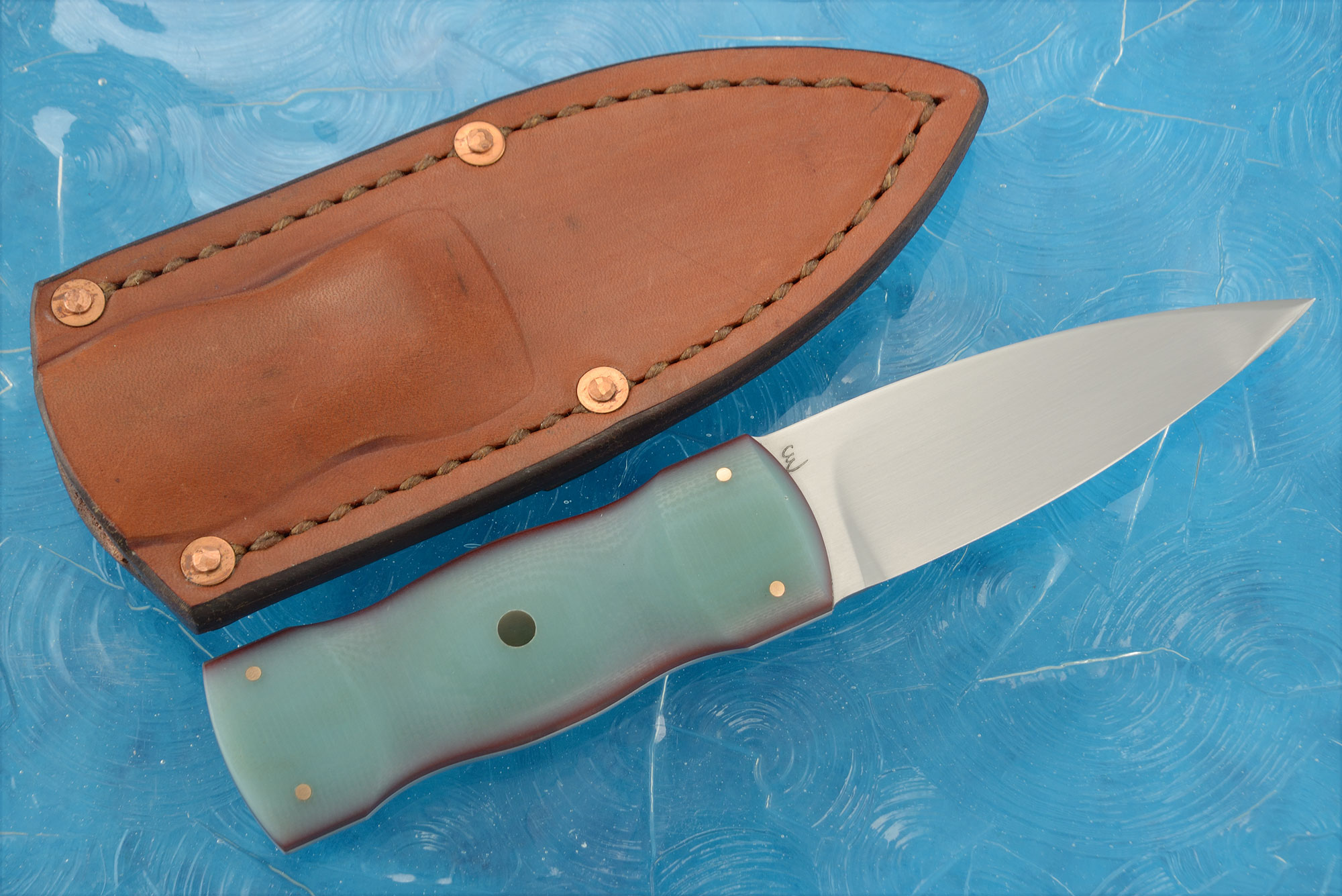 Handle scales are opal G10, secured to the full tang using bronze pins. The handle is sculpted to provide a comfortable, non-slip grip.