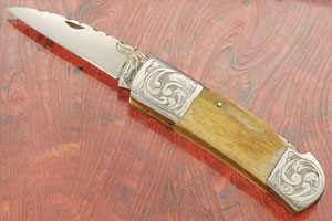 Description: This elegant folding knife by Montana knifemaker Mel Fassio immediately demands attention. Mel makes this entire knife by hand, including the engraving.