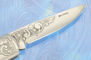Description: This elegant folding knife by Montana knifemaker Mel Fassio immediately demands attention. Mel made this entire knife by hand, including the engraving.