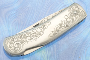 Stainless steel handle scales are hand engraved to match the blade. The scales are attached to the frame using pins. The backbar and lock spring are satin finished.