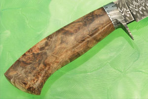 The handle is stabilized red maple burl, sculpted to provide a comfortable grip. This knife is compact and easy to carry, yet large enough to fill out the hand and do most tasks. The handle is fit to a twist pattern damascus guard. A fileworked stainless steel spacer separates the guard from the handle.