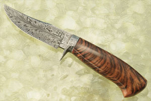 The blade is Feather pattern damascus forged from carbon steels. The damascus is highly controlled and shows tremendous skill at the forge. Curt's touchmark is on the left ricasso. The blade is distal tapered for perfect balance in hand.