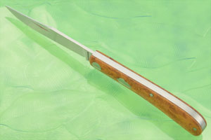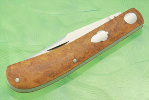 This is Hunsberger's Trapper slipjoint folding knife. The blade is CPM 154 stainless steel, cryo treated at 61 Hrc. It is hand ground with a satin finish. It features a thin swedge and a hollow grind.