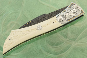 Damascus Engraved Folder with Carved Mammoth Ivory and Gold Inlays