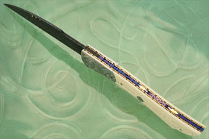 Mammoth ivory scales are hand carved by Frank into meticulous scrollwork. Hand engraved pins are inlaid into both sides of the handle. The hand engraved scroll carving moves from the ivory into the engraved steel bolsters. A 24K gold border is inlaid around the bolster engraving. Gold nitre blued and fileworked liners surround a nitre blued and fileworked steel backbar. Both sides of the backbar are hand engraved and inlaid with 24K gold.