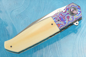 The bolsters are ZircuTi titanium/zirconium. The intricate coloring offers excellent contrast to antique Westinghouse Micarta handle scales. This Micarta was developed in 1910 by Westinghouse Electric Corporation as an industrial thermo-set laminate for electrical insulation. This light toned Micarta was lost in a warehouse and only recently discovered. The top shows the beautiful yellowing with age that makes this unique Micarta so captivating. Jimping on the thumb ramp provides a comfortable, secure grip. The gently rounded handle feels sturdy and fills your hand perfectly. Anodized and fileworked titanium liners surround an anodized titanium backbar. The 3D machined titanium pocket clip with ceramic retention ball is mounted for right handed, tip-up carry. Exceptional fit and finish throughout!