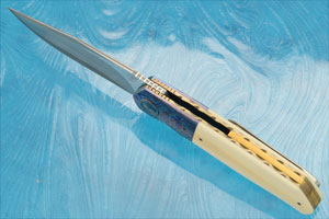 The blade is hand ground stainless damascus san mai. A central bar of Takefu SG2 powdered metallurgical stainless steel is surrounded by alternating layers of stainless steel and nickel. At Hrc 63-64, this folder has among the best edge holding of any Thorburn knife ever made. The resulting damascus is high contrast and immediately captivating. The linear damascus reveals Andre's complex, super-clean grind. The flats are mirror polished, nearly hiding the pattern. The blade is hollow ground for an easy to maintain edge.