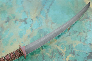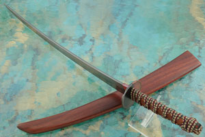 The handle is bloodwood, well known for its bright red color. The bloodwood handle was wrapped in silk using a traditional Japanese wrap, known as tsuka ito, to provide a comfortable grip. A copper menuki is tightly wrapped under the silk. The tsuba guard combines blackened diamond plate and copper. A scarlet red copper habaki finishes the handle.