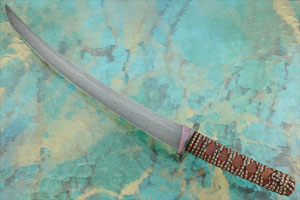 The 18-1/2 inch upswept blade is forged from Mardi's own damascus combining 1080 and 15N20 carbon steels to ensure excellent edge holding and chip resistance. The damascus pattern is high contrast and extremely engaging. Mardi's touchmark is on the left side of the blade. Because the blade is forged from carbon steels, we recommend using camellia oil to protect the blade and natural wood handle.