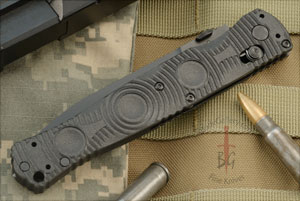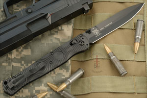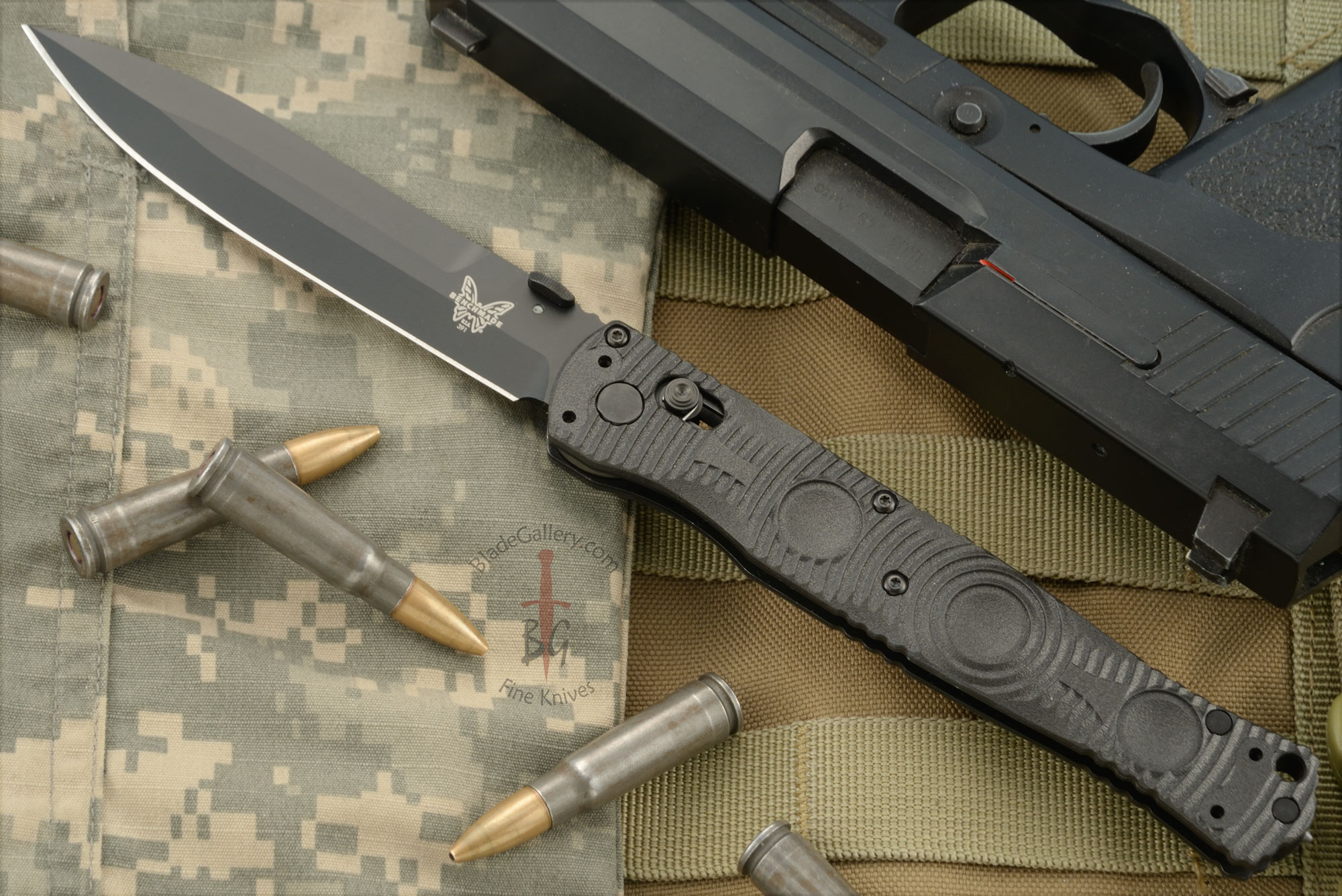 The 4-1/2 inch spear point blade is D2 semi-stainless steel and features Benchmade's black coating for rust resistance and light reflectivity. The blade can be easily deployed using the ambidextrous thumb disc.
