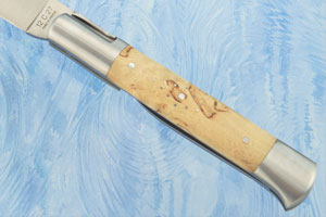 Masur birch handle scales are accented with fine hand-set stainless pins and brushed stainless steel bolsters.. Masur birch is grown in the forests of Northern Europe and harvested in winter from a frozen landscape. The unique figure only appears when the tree has been in particular soil conditions.