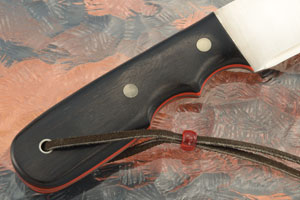 African blackwood handle scales are set on the full tang for strength and durability. African blackwood (Dalbergia melanoxylon) is among the most dense, durable woods in the world and is highly prized for its jet black appearance. Red G-10 liners add a touch of contrast to the jet black scales. A leather lanyard is included at the rear of the knife for extra retention.