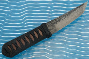 This Damascus Kwaiken was forged to shape from Ben's own damascus, incorporating 1080 and 15N20 carbon steels. The flats are forge finished. The grinds reveal the damascus pattern. The swedge moves into an armor-piercing tip.