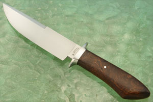 A 416 stainless steel guard complements the presentation grade Arizona desert ironwood handle. Desert ironwood (Olneya tesota) is a rare wood that is only found in the valleys of the Sonoran Desert below 2,500 foot elevation. It is extremely dense and durable. In fact, it is so dense, that if a piece is dropped in water it will sink! The contoured handle swells toward the back resulting in a sure, comfortable grip.