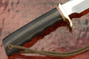 The black Micarta handle is carved with finger grooves to provide a non-slip grip. The contoured handle is very comfortable in hand. A polished brass guard prevents your hand from sliding over the blade. Red, white, and blue spacers finish the handle. A green paracord lanyard is included to provide extra retention in hand.