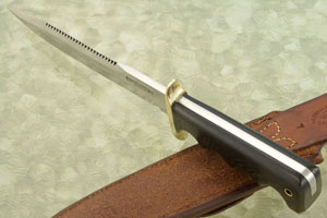 The 6-3/4 inch blade is forged from 440B stainless steel and was heat treated to Hrc 55-56, ensuring a resilient, durable edge. The left side of the blade features the Randall Knives logo: "Randall Knives - Orlando, FL". An S in the mark signifies this is a stainless steel blade. The top of the blade is serrated.