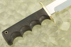 The handle is black Micarta. Deep finger grooves provide a solid grip even with wet hands. The guard is polished brass which prevents your hand from sliding over the blade. A brass lanyard tube allows for a lanyard in the rear for extra retention.