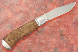 Handle scales are stabilized York gum burl ( Eucalyptus loxophelba) secured to the fileworked liners using hand domed pins. York gum comes from a very small tree and is exceptionally rare. It is a elegant wood with tremendous figure. The scales are perfectly fit to satin finished front and rear bolsters. The left scale is inlaid with an oval stainless steel escutcheon. The scales and liners are integral for superior build strength.