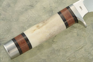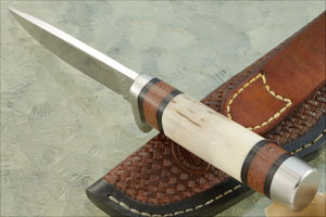 This knife is Paul's rendition of a Randall Model 25. The drop point blade is hand ground AEB-L stainless steel. Many knifemakers and metallurgists feel that AEB-L, with its small crystalline size, tremendous edge stability and toughness, is among the best stainless steels used in knifemaking today. AEB-L was developed for razor blades with a very fine grain structure making it easy to sharpen while maintaining good edge holding capabilities. The blade features a hollow grind, providing a razor sharp edge that won't need to be thinned over time. A choil allows you to comfortably choke up on the blade for more detail oriented tasks.