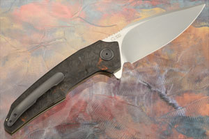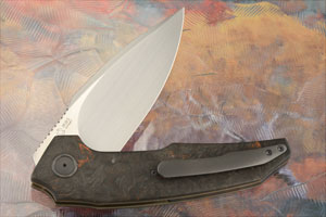 Handle scales are Orange Dark Matter FatCarbon. The custom external pivot and collar are heat colored zirconium. Jimping on the thumb ramp aids grip. The gently rounded handle feels sturdy and fills your hand perfectly. Anodized titanium liners surround a carbon fiber backbar. CTS-XHP is engraved on the inside of the titanium liners. The 3D machined zirconium pocket clip is mounted for right-side, tip-up carry.