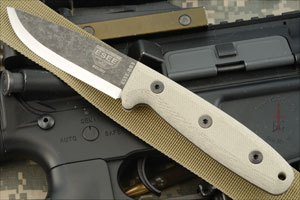 The ESEE-RB3 would feel right at home in almost any environment, from deep in the Amazon jungle to walking around your neighborhood. The 3-1/2 inch blade features a Scandi grind (preferred by many bushcrafters) and a stonewash black oxide finish. This would be a perfect choice for a daily-carry utility knife bushcrafting knife, or skinning knife. It would be equally adept helping you prepare your next meal around the campfire.