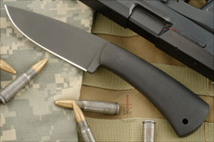 The blade is 80CrV2 carbon steel -- a steel that takes and holds an incredibly keen edge. A Caswell black oxide finish is both non-reflective and provides limited rust resistance. A skeletonized full tang means great balance.