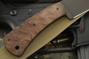A walnut wood handle is set on the full tang and secured using three pins. The scales are hand sculpted for a comfortable, secure grip. Engraving along the spine offers an easy thumb purchase.